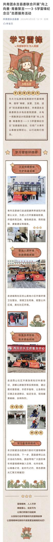 為大力弘揚和培育新時代雷鋒精神,倡導“奉獻、友愛、互助、進步”的志愿服務理念,共青團永吉縣委聯合水電總醫院團委、水電一局勘測設計院團委開展“向上向善·青春聚吉——3·5學雷鋒紀念日”志愿服務活動,引領廣大青年以奉獻詮釋初心,以行動踐行擔當。 義診情暖桑榆,守護長者安康:青年志愿者們走進頤康養養老院開展愛心義診,為老人們開展基礎檢查,并提供常見病、慢性病咨詢、用藥指導、康復建議等服務。 整治人居環境,扮靚美麗家園:走進城南社區優山美地小區開展環境衛生整治,清理衛生死角、規整公共區域,美化社區環境。 科普急救技能,筑牢安全防線:走進西山社區開展急救知識科普培訓,講解心肺復蘇等實用技能,通過面對面答疑、手把手指導,讓急救知識真正走進群眾、貼近生活,現場暖意融融、反響熱烈。 本次聯建活動是踐行新時代雷鋒精神的生動實踐,下一步,團縣委將以此次活動為契機,團結帶領廣大團員青年將雷鋒精神融入日常、化作經常,以青春之名、赴時代之約,用志愿微光匯聚文明暖流! |