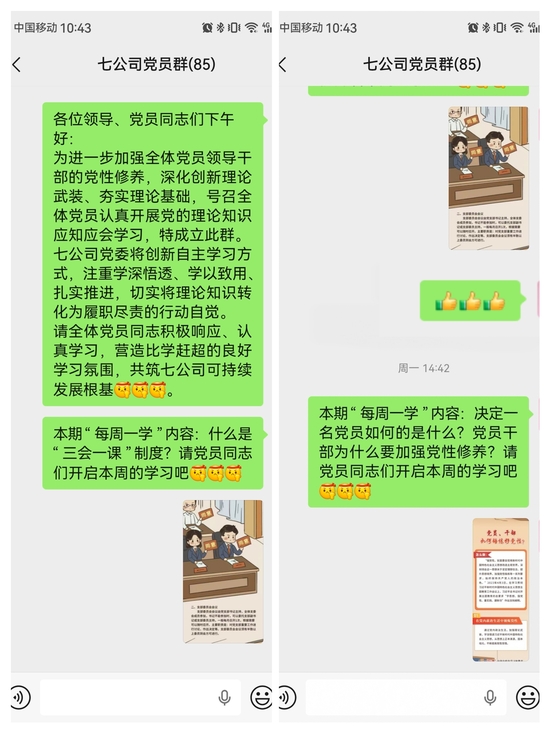 七公司黨委堅持把黨員教育管理作為夯實黨建基礎(chǔ)、提升隊伍素質(zhì)的重要抓手,立足常態(tài)長效、系統(tǒng)推進,創(chuàng)新建立常態(tài)化學(xué)習(xí)機制。該機制是七公司黨委加強黨員日常教育、強化理論武裝、深入宣貫黨的二十屆四中會精神的一項重要舉措,旨在通過系統(tǒng)化的學(xué)習(xí)安排,持續(xù)提升黨員政治素養(yǎng)和履職能力?;顒右劳悬h員微信群,著力破解傳統(tǒng)學(xué)習(xí)中“時間難統(tǒng)一、形式較單一、效果難檢驗”等現(xiàn)實問題,以圖文并茂、簡潔易懂的學(xué)習(xí)小貼士為載體,推動黨員干部利用碎片化時間隨時隨地“充電蓄能”,實現(xiàn)理論學(xué)習(xí)融入日常、學(xué)在經(jīng)常、用在平常。 精準錨定學(xué)習(xí)方向,內(nèi)容設(shè)置“靶向發(fā)力” 七公司黨委精心構(gòu)建“多維立體”學(xué)習(xí)內(nèi)容體系,緊扣黨員教育核心需求,依托黨員微信群搭建學(xué)習(xí)新陣地,開展“每周一學(xué)”微教育。內(nèi)容聚焦夯實黨的基礎(chǔ)常識,厘清核心概念;黨史關(guān)鍵節(jié)點,回溯黨的奮斗歷程;解讀黨內(nèi)法規(guī)核心條款,明晰行為準則;傳達全會精神應(yīng)知應(yīng)會,把握時代脈搏;提煉黨的創(chuàng)新理論金句,凝聚思想共識;講述先進黨員事跡,汲取奮進力量。每期內(nèi)容均經(jīng)過精心篩選打磨,突出政治性、理論性,兼顧通俗性、實用性,實現(xiàn)“干什么學(xué)什么、缺什么補什么”的精準供給,確保學(xué)習(xí)不走過場、不搞形式。 創(chuàng)新學(xué)習(xí)傳播形式,云端課堂“便捷高效” 打破“念文件、劃重點”的傳統(tǒng)模式,以可視化、輕量化的學(xué)習(xí)小貼士圖片為主要形式,通過黨員微信群定向推送,打造“指尖上的移動課堂”。無論是通勤路上、工作間隙,還是休息之余,黨員只需輕點手機,就能開啟學(xué)習(xí)之旅。 首期學(xué)習(xí)聚焦黨的組織生活基本制度——“三會一課”,以卡通插畫搭配精煉文字的形式,清晰闡釋支部黨員大會、支部委員會會議、黨小組會的召開頻次、參會范圍、核心流程及決議生效條件,詳細說明黨課的組織形式、參與范圍和授課要求,讓黨員快速掌握制度規(guī)范,為規(guī)范支部組織生活筑牢基礎(chǔ)。 第二期聚焦“黨性修養(yǎng)”這一立身之本,從“黨性是什么”“為什么要加強黨性修養(yǎng)”“如何錘煉黨性”三個維度展開,結(jié)合夏明翰、方志敏等革命先烈的堅定信仰,楊根思、黃繼光等英雄模范的崇高壯舉,以及谷文昌、高德榮等先進典型的實干擔(dān)當,將黨性概念具象化、生動化,引導(dǎo)黨員在榜樣力量中感悟初心使命,在理論學(xué)習(xí)中強化黨性覺悟。 兩期內(nèi)容推送后,黨員微信群內(nèi)互動熱烈,大家紛紛分享學(xué)習(xí)心得、交流實踐感悟,黨員代表談到,通過系列學(xué)習(xí),愈發(fā)深刻體會到黨性需在小事小節(jié)中涵養(yǎng)。大家牢記“堤潰蟻孔、氣泄針芒”的古訓(xùn),自覺在小事小節(jié)上嚴以修身,于一點一滴中完善自我。群內(nèi)已然形成“比學(xué)趕超”的濃厚氛圍,讓云端學(xué)習(xí)不再是“單向灌輸”,而是“雙向互動”。 據(jù)悉,第三期內(nèi)容將圍繞黨的二十屆四中全會提出的“52167”數(shù)字體系進行解讀,幫助黨員干部進一步把握國家治理現(xiàn)代化的核心要義。 學(xué)習(xí)無止境,奮進正當時。依托“小屏幕”搭建“大課堂”,借勢“微載體”凝聚“強動能”,一場覆蓋全體黨員、融入日常的理論學(xué)習(xí)熱潮正在七公司蓬勃興起。七公司黨委將持續(xù)深化黨員教育管理工作,以更高站位錨定學(xué)習(xí)方向,不斷豐富黨的創(chuàng)新理論知識等學(xué)習(xí)內(nèi)容,通過常態(tài)化開展交流分享、知識問答等活動強化互動實效,讓理論學(xué)習(xí)從“被動聽”變?yōu)椤爸鲃訉W(xué)”。 七公司黨委將始終堅持學(xué)思用貫通、知信行統(tǒng)一,緊扣“決戰(zhàn)四季度、沖刺全年度”的核心目標,推動學(xué)習(xí)成果轉(zhuǎn)化為破解發(fā)展難題的實招、攻堅沖刺的硬功、提質(zhì)增效的良策、服務(wù)群眾的舉措,以永不懈怠的學(xué)習(xí)姿態(tài)和一往無前的奮進精神,為公司高質(zhì)量發(fā)展注入不竭動力。 |