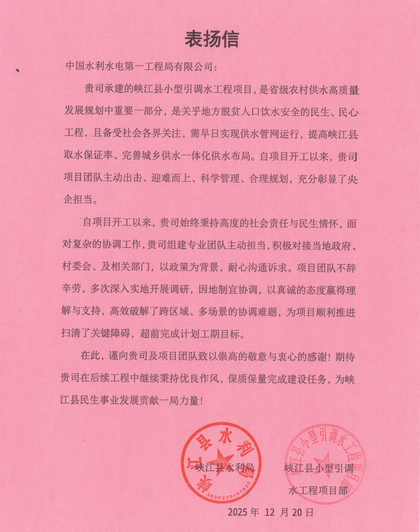 日前,公司承建的峽江縣小型引調水工程項目收到峽江縣水利局發來表揚信,信中對項目主動出擊、迎難而上解決項目建設中的復雜協調難題,以高度的社會責任與民生情懷扛起建設重任,以及項目超前完成施工計劃給予高度認可。 峽江縣小型引調水工程項目憑借系統化的取水設施、互聯互通的供水管網及高效的加壓泵站,構建起“源通、管連、網暢”的水資源調配體系,不僅能優化區域水資源配置格局,更將成為連接“水安民生”與“業興民富”的關鍵紐帶,用以保障仁和鎮、戈坪鄉、硯溪鎮、金江鄉等10個鄉鎮12.9萬人生活用水,推動形成水利保障民生、產業帶動發展的良性循環。 自進場以來,項目團隊跨區域協調涉及多方訴求,多場景推進需兼顧政策要求與實際情況,組建專業協調小組,主動對接當地政府、村委會及相關部門,制定最貼合實際的協調政策。多次深入項目沿線實地調研,因地制宜優化方案,成功破解了一系列制約項目推進的關鍵障礙,實現超前完成計劃工期的亮眼成績,為工程后續保質保量推進奠定了堅實基礎。 此次收到表揚信不僅是業主單位對項目部攻堅克難、優質高效履約的認可和贊揚,也是對項目部在新的一年再創佳績的激勵與鞭策。接下來,項目部將持續發揚優良作風,高質量、高效率地完成后續施工任務,全力以赴打造優質工程、民生工程。 |