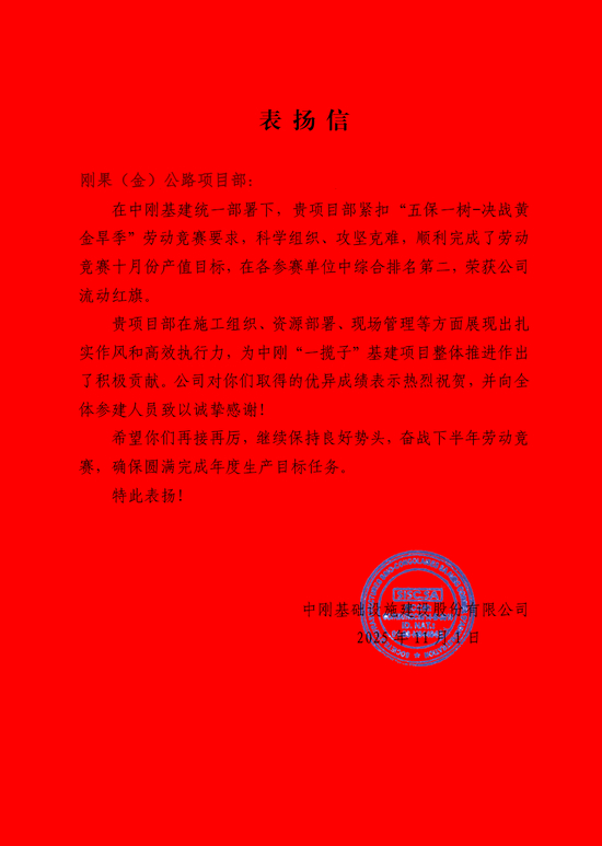 11月1日,在業主單位中剛基礎設施建設股份有限公司(以下簡稱“中剛基建”)組織開展的“五保一樹-決戰黃金旱季”勞動競賽中,剛果(金)公路項目部以科學組織、攻堅克難的作風,順利完成十月份產值目標,在各參賽單位中脫穎而出,榮獲流動紅旗榮譽及表揚信。 剛果(金)公路項目部高度重視勞動競賽活動目標,緊抓旱季施工的黃金季節,以“起步即沖刺、開局即決戰”姿態,鼓足干勁,全力以赴掀起施工熱潮。項目部在施工組織、資源部署、現場管理等方面展現出扎實的作風與高效執行力。全體員工頑強拼搏、精心施工,緊扣任務節點,優化施工組織,抓牢安全質量,為中剛“一攬子”基建項目推進作出了積極貢獻。 此次獲得的榮譽,是項目團隊全體參建人員拼搏奮斗的成果,是對項目部全體員工攻堅克難精神的充分肯定。項目部將以此次表彰為契機,再接再厲,全力確保高質量完成年度生產目標任務,為公司國際業務建設發展再立新功。 |